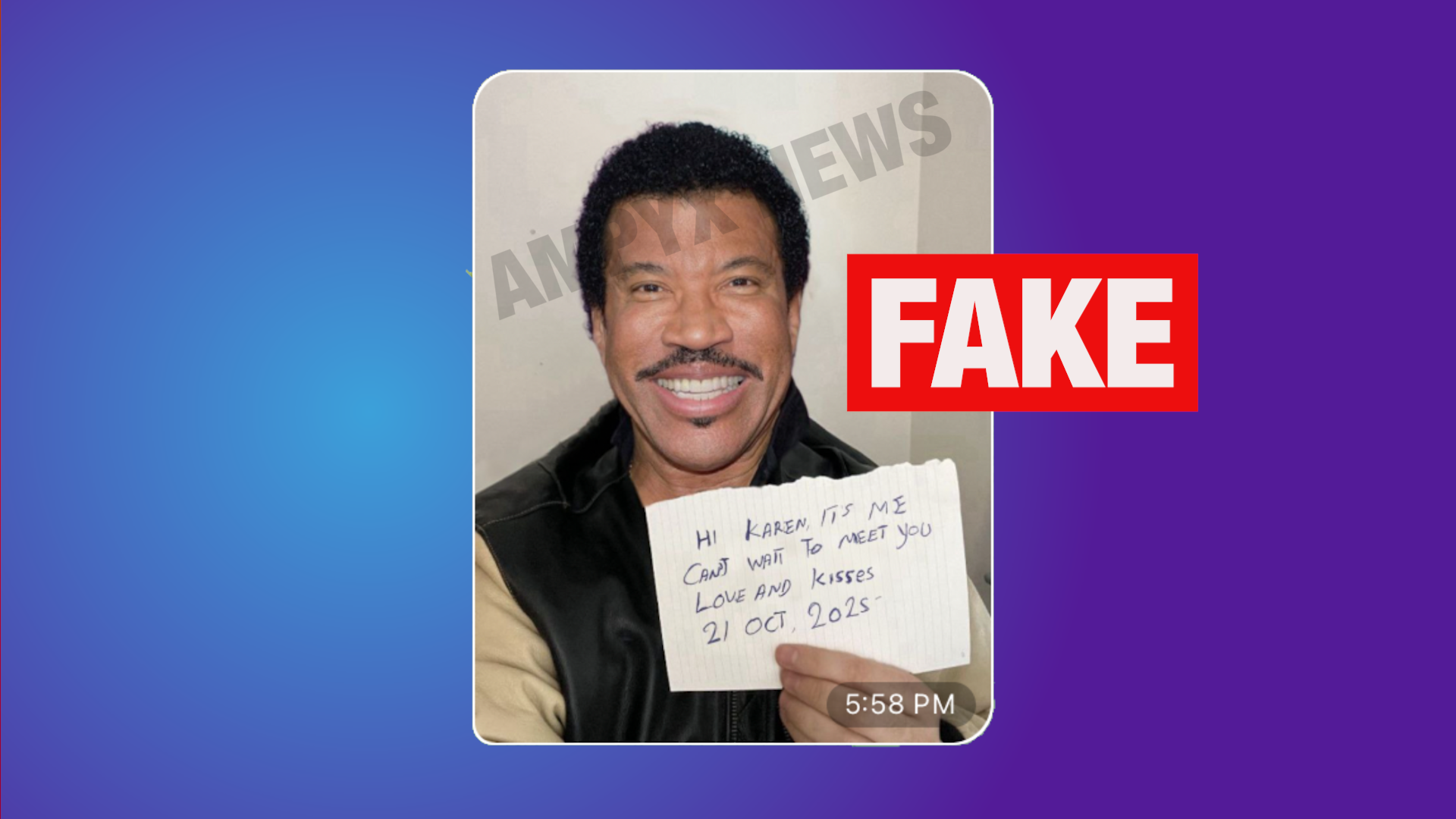 Deepfake image of Lionel Richie holding a paper with a handwritten note. Image: Ampyx News.